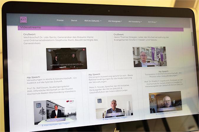 Prof. Dr. Ralf Daum, Studiengangsleiter BWL-Öffentliche Wirtschaft an der Dualen Hochschule Baden-Württemberg Mannheim, gab in seiner Video Key Speech einen Ausblick auf die hybride Zukunft der Verwaltungen in Kirche & Sozialwirtschaft. Prof. Dr. Friedrich Vogelbusch, Professor an der Hochschule für Soziale Arbeit in Dresden & Mitherausgeber der Zeitschrift KVI im DIALOG, thematisierte in seiner Key Speech "Transparenz in Kirche & Sozialwirtschaft - Ein Prozess voller Herausforderungen" die Entwicklung Transparenzbemühungen. Peter S. Nowak, Sprecher der KVI Initiative, Herausgeber der KVI im DIALOG & Geschäftsführer der interim2000 GmbH, thematisierte in seiner Video Key Speech die finanziellen Rahmenbedingungen für die Modernisierung der Verwaltungen. Die jüngste KVI Initiative Auswertung der Einnahmen des Sektors Kirche & Sozialwirtschaft zeige sehr gute Rahmenbedingungen, um die Verwaltungen zu modernisieren und im Hinblick auf die Digitalisierung zukunftsfähig zu machen.